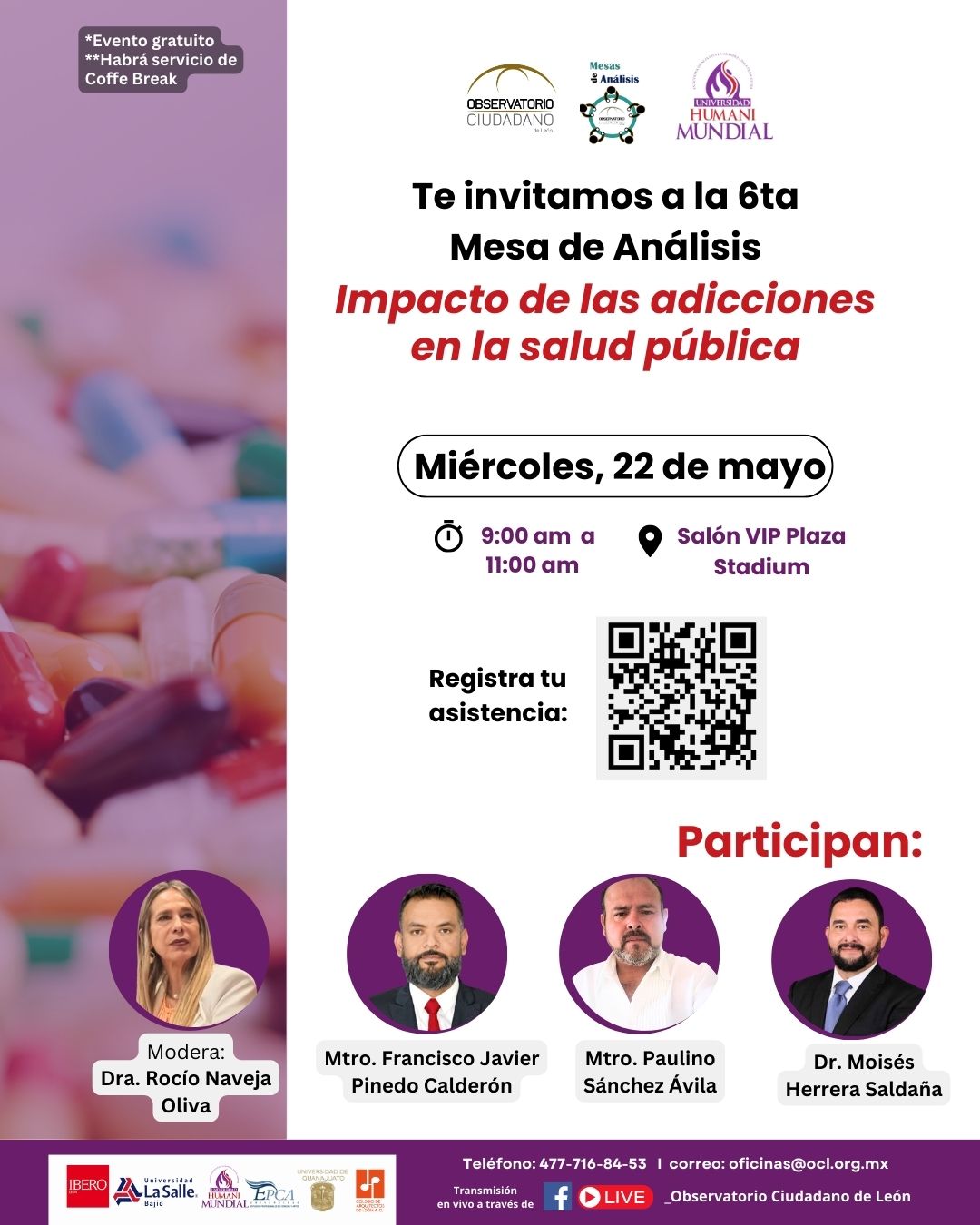 Para el desarrollo de esta mesa de análisis se tuvo la participación del Mtro. Francisco Javier Mariano Pinedo Calderón, actual Coordinador de la Unidad de Especialidad Médica, Centro Comunitario de Salud Mental y Adicciones Guanajuato, adscrita a la Jurisdicción Sanitaria I de la Ciudad de Guanajuato, (Secretaría de Salud del Estado); el Mtro. Paulino Sánchez Ávila, director del centro de rehabilitación ‘La Búsqueda’; el Dr. Moisés Herrera Saldaña, director General de Prevención del Delito y Participación Social de la Secretaría de Seguridad, Prevención y Protección Ciudadana de León, así como la moderación de la Dra. Rocío Naveja Oliva Presidenta del Observatorio Ciudadano de León y Rectora de la Universidad Humani Mundial.