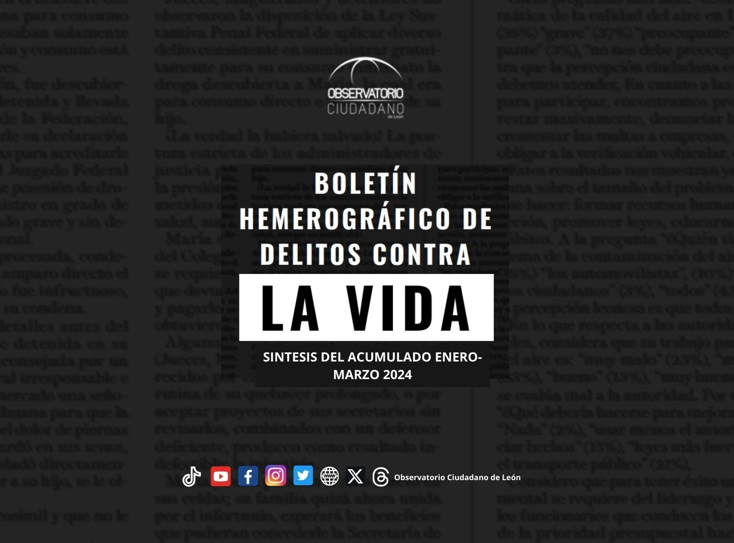 El presente Boletín Hemerográfico monitorea cuatro delitos que atenta contra la vida: el homicidio doloso, feminicidio (que a la fecha no tuvo registro), homicidio culposo y las lesiones dolosas a partir del seguimiento diario de los delitos contra la vida, publicados en fuentes hemerográficas locales, retomando la información relevante de los hechos, que permite establecer variables relacionados con las víctimas, victimarios, lugar y hora de hallazgo, entre otros.