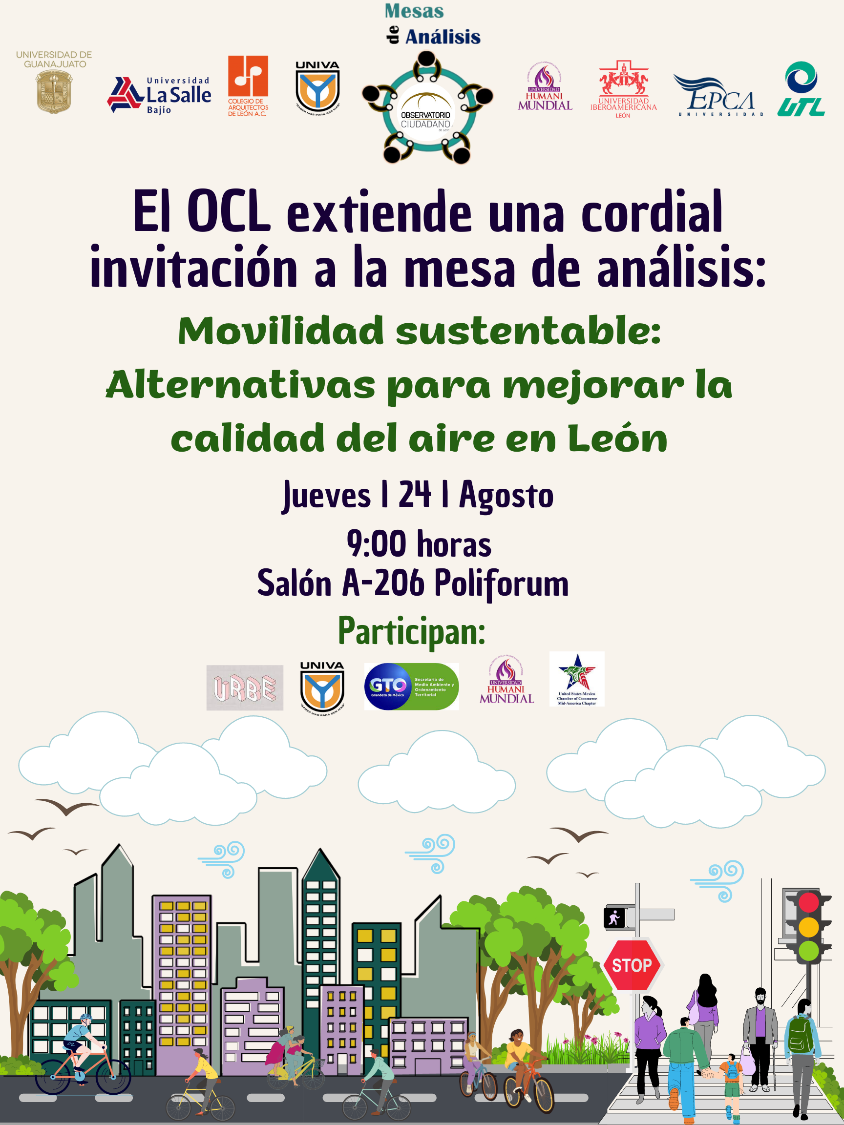 Comenzamos este ciclo de Mesas de Análisis el jueves 24 de agosto del 2023 con un tema de sumo interés como lo es la movilidad sustentable, para lo cual contamos con la participación del Ing. Carlos Aarón Ávila Plascencia quien es Director General de calidad del aire (SMAOT); el Mtro. Salvador López de Lara Vega, Profesor Universidad UNIVA; el Ing. Sergio Ponce López, Presidente Cámara de comercio México – Estados Unidos; el Mtro. Taurino Andrade Ramírez, Profesor Universidad HUMANI Mundial; la Lic. Claudia García González y el Mtro. Ernesto Ramírez García, ambos del Colectivo URBE.